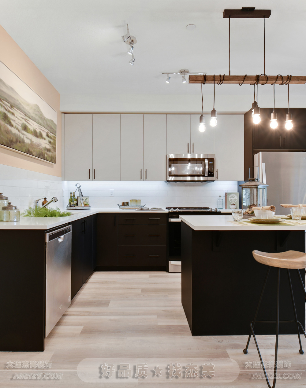 廚房的白色臺面與黑色櫥柜形成了鮮明的對比。