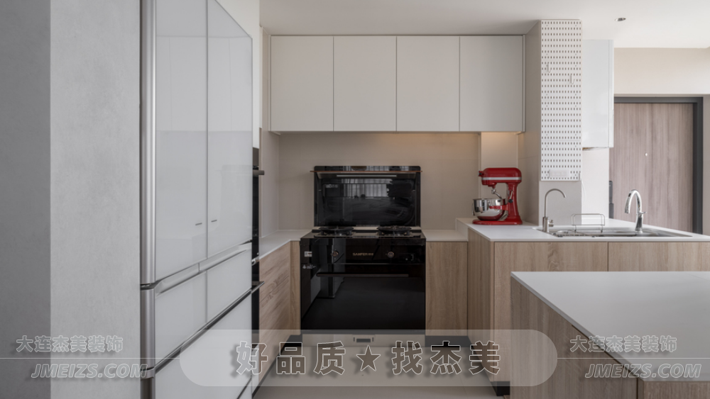 中島臺的設計:廚房中心位置定制了一個中島臺,島臺上安裝了水槽,非常適合進行烘焙、簡餐等工作。