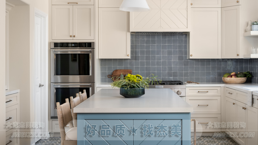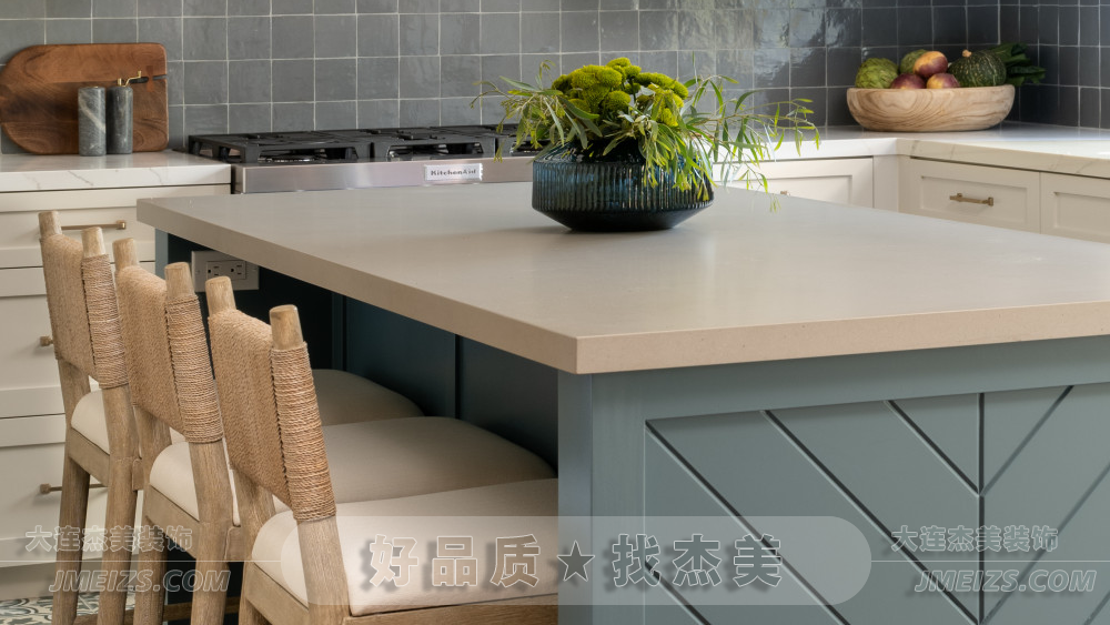 廚房中間的島臺,采用了淺藍色的柜體設計,與整體的白色形成了鮮明的對比。
